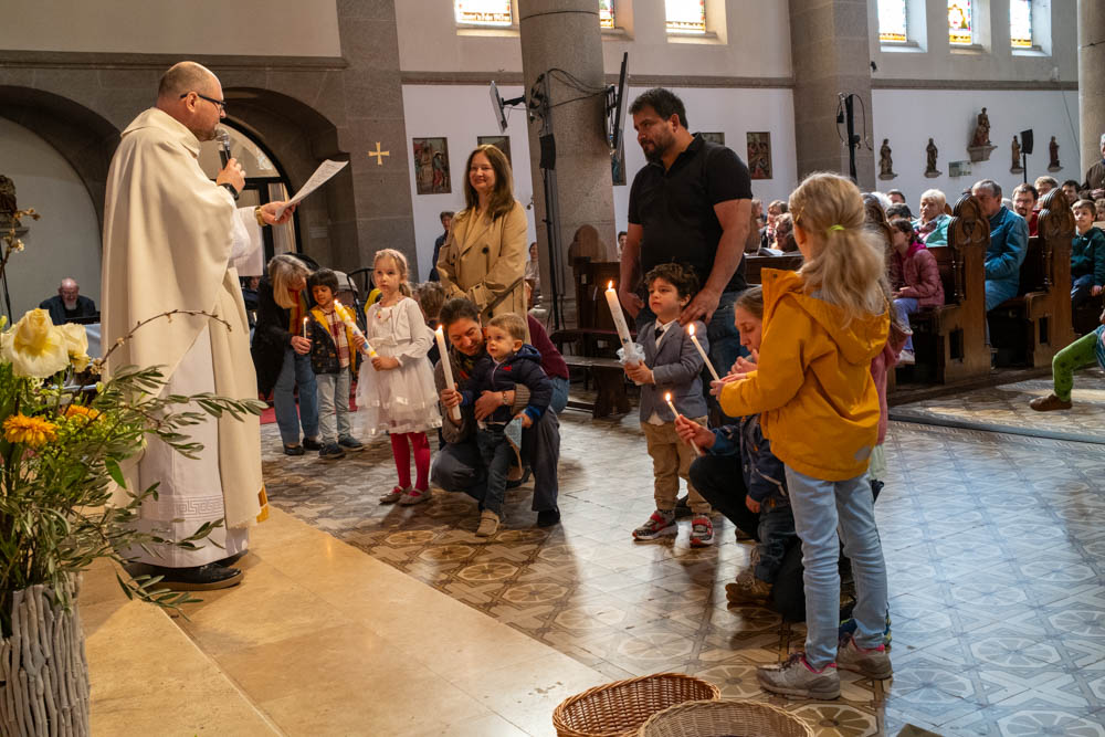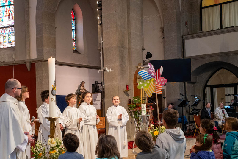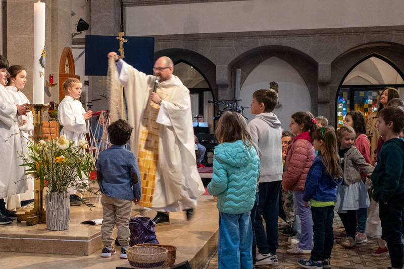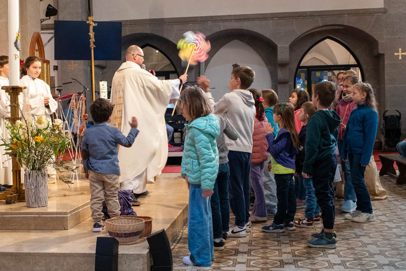 Als Evangelium wurde über das unertwartete Erscheinen des auferstandenen Jesus unter den im See Tiberias gerade Fische fangenden Jüngern berichtet. Den vor dem Altar versammelten Kindern wurde ein Stück Fischernetz gezeigt und dass Fische an Land zu ziehen schwere Arbeit ist.