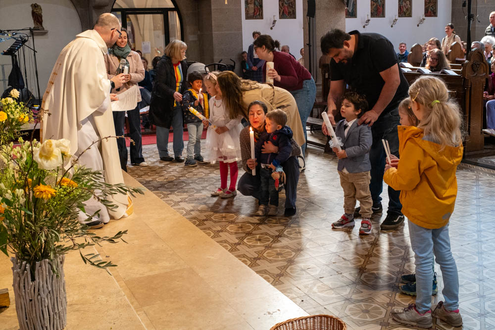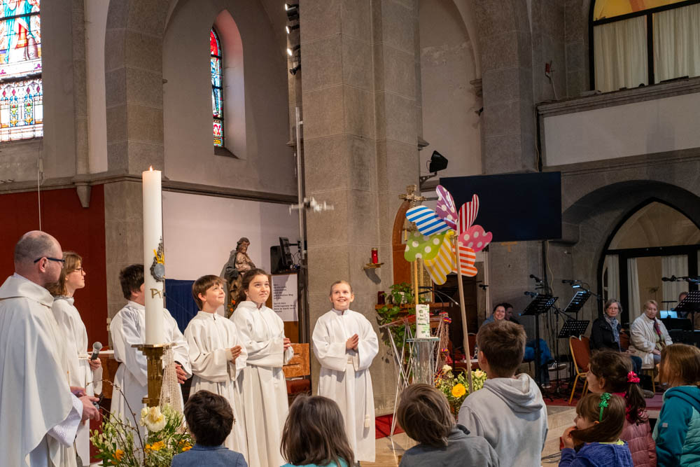 Im Familiengottesdienst am Sonntag, 19.4.2026, stand die Erinnerung an die eigene Taufe im Mittelpunkt. Die Taufe als Start in das christliche Leben, heute meist von Kleinkindern, aber auch Schulkindern, empfangen. Zur Erinnerung wurde aber alle Mitfeiernden eingeladen, bis hin zu den Senioren, den Taufe ist kein vergängliches Ereignis.